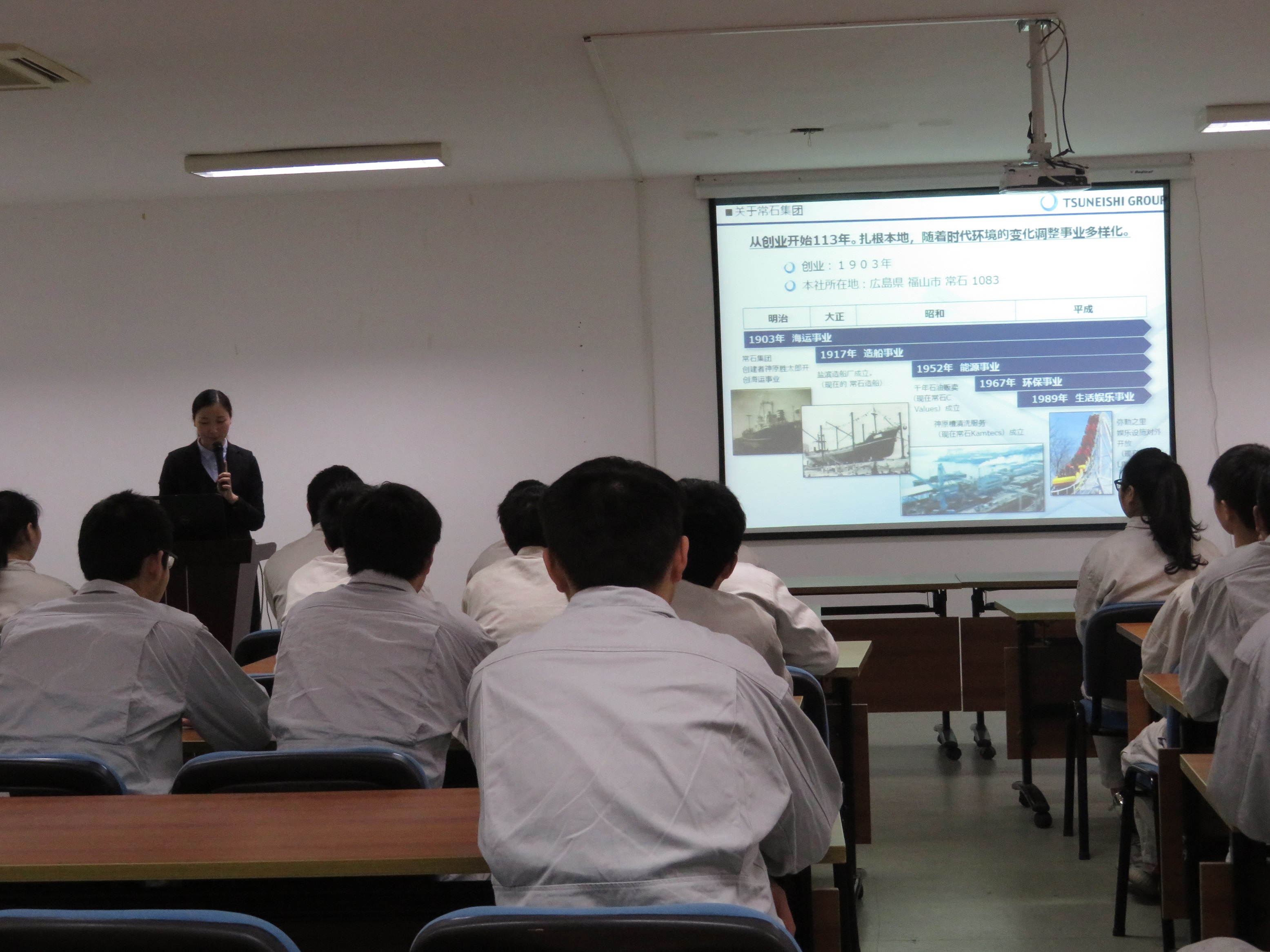 前輩為我們介紹集團(tuán)事業(yè)概要時,我聽得極為認(rèn)真。前輩說:常石集團(tuán)是一個百年集團(tuán),目前,已在日本,中國,菲律賓,巴拉圭開設(shè)了船廠,并涉及了包括環(huán)保、造船、航運(yùn)、能源、娛樂在內(nèi)的這幾個行業(yè)領(lǐng)域。前輩講到最后的那句話特別讓我感動,她說:我們每個人都要保持一顆好奇的心去探究未來。